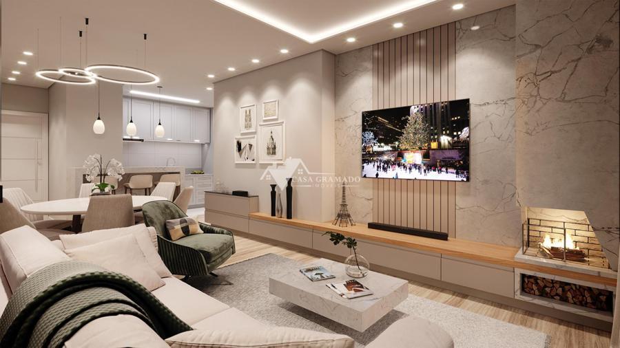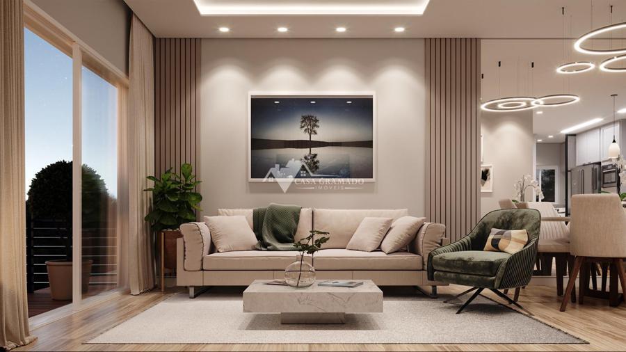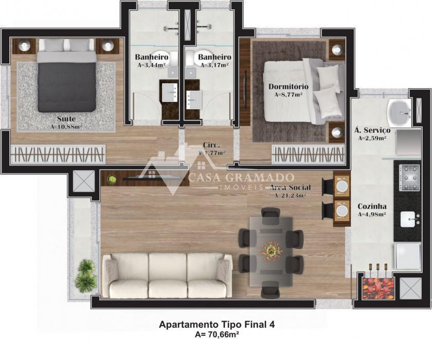 Apartamento de dois dormitórios sendo um suíte, com churrasqueira, área de serviço, banheiro social, cozinha, estar/living, piso laminado e piso porcelanato, esperas para água quente/split/automação, teto rebaixado em gesso.