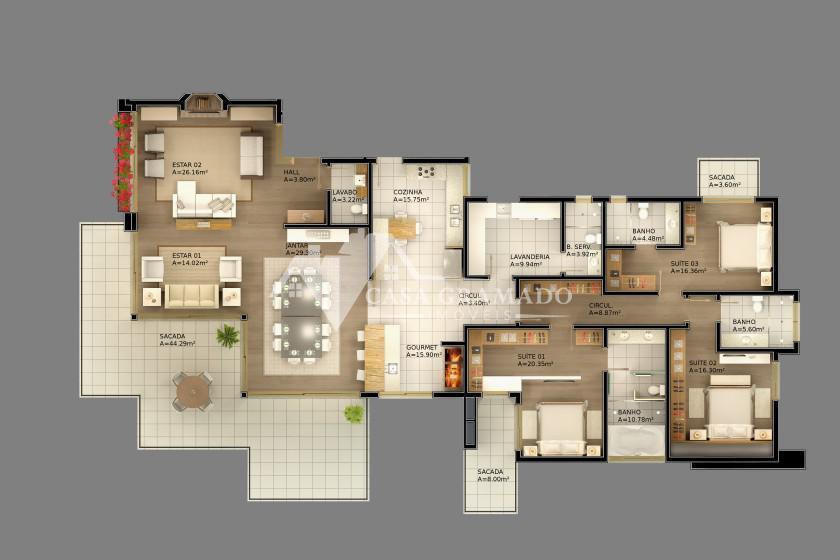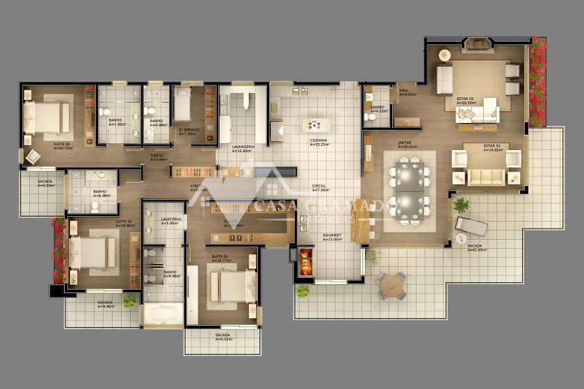 Somente 12 unidades, divididas e dois blocos, o La Roca Gris e o La Roca Negra, cada um com 4 apartamentos e dois penthouses, todos com três suítes mais suíte de serviço e amplos terraços com vista permanente para o Vale do Quilombo.